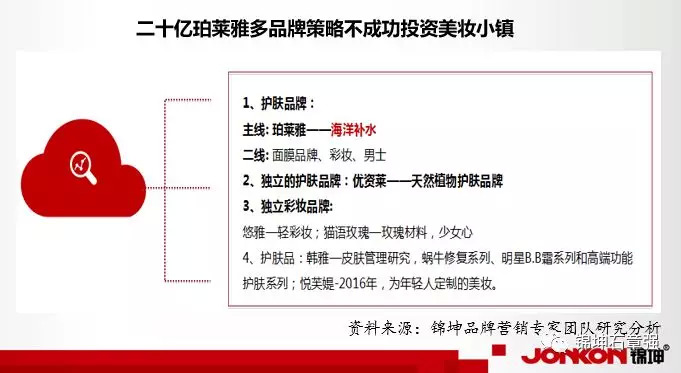 国内美妆品牌竞相发展过程中,找到品牌核心基因开始踏上成长的高速轨道。百雀羚找到本草+保湿+大众化,适时拥抱新媒体并实现和年轻人沟通,推出年轻的三生花顺风顺水。上美找到爆款+大广告,第二品牌一叶子面膜主打新鲜成功突围。美妆集团在主品牌风格成熟之际,推出的第二品牌更容易存活!