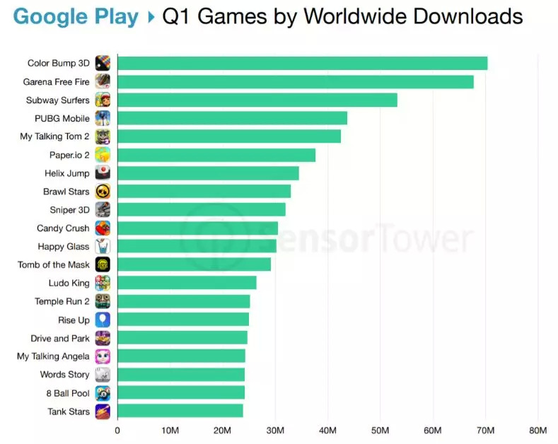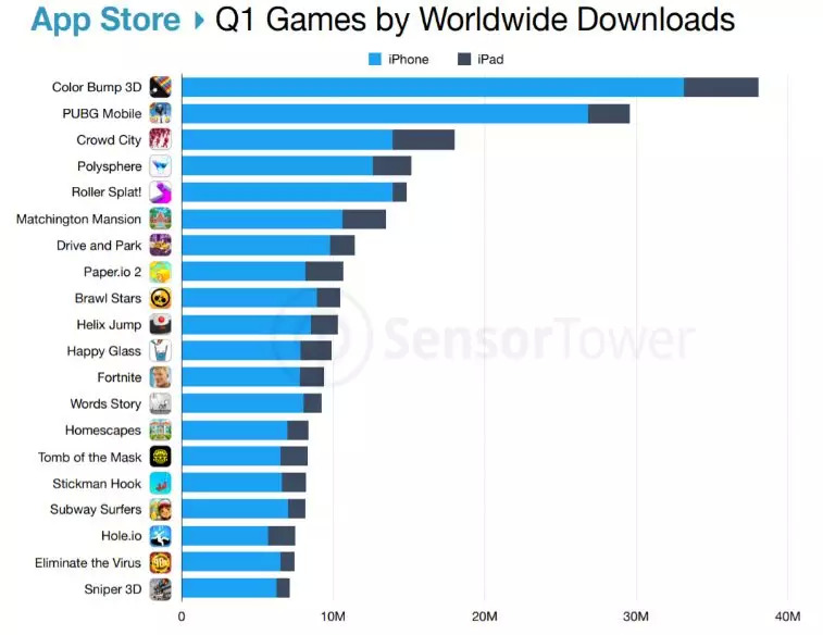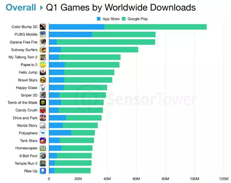 近日,市场研究机构SensorTower发布了2019年第一季度全球手游下载榜单。根据榜单信息,Good Job Games出品的《Color Bump 3D》表现强劲,一举拿下全球手游下载桂冠。