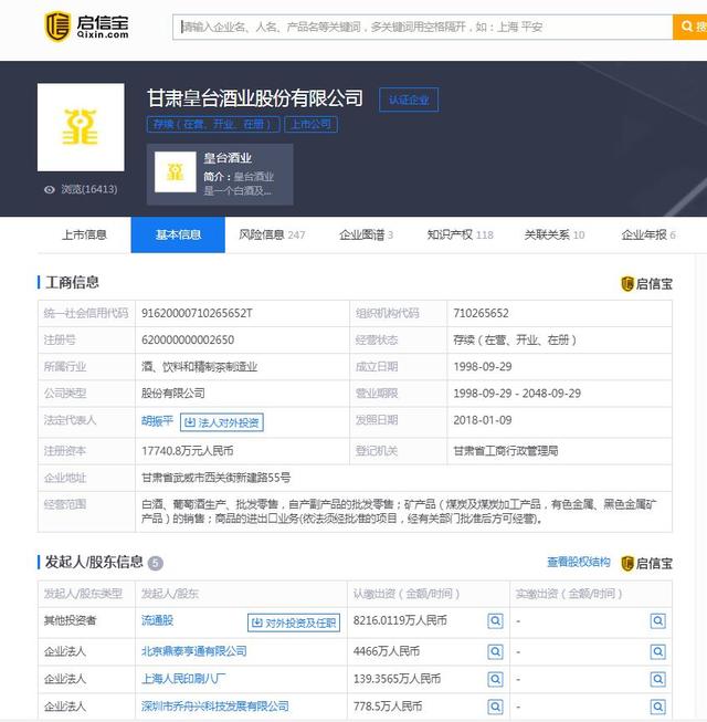 然而就是这个被迫暂停上市、亏损严重的皇台酒业却是曾经中国最有名的酒业传奇,根据启信宝的数据显示,甘肃皇台酒业股份有限公司成立于1985年,是改革开放之后设立的一个全新的白酒企业,相比于茅台、五粮液、剑南春等等老牌名酒,皇台几乎没有任何的历史基础,但就是这家一穷二白连建设都是依靠“全部贷款”的企业,却在短时间内迅速崛起,从1988年酒厂建成到了1993年的时候,皇台已经成为了中国饮料制造业最佳经济效益500强之一,位列全国大型一档企业和国家一级酿造企业。1994年,在第二届巴拿马万国博览会上,皇台与茅台双双荣获特别金奖,可见这家企业的辉煌。
