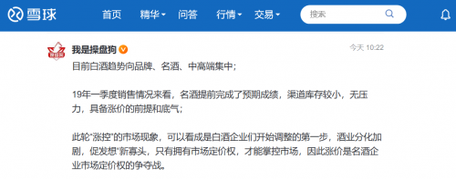 在白酒股价飞升的背后,是白酒酒企品牌和产品战略的调整。正如雪球用户@我是操盘狗所言,目前白酒企业趋向于打造自身品牌,开拓中高端市场。从一季度的销售情况来看,名酒提前完成预期业绩,俱备涨价基础。酒业分化加剧,涨价是名酒企业市场定价权的争夺战。