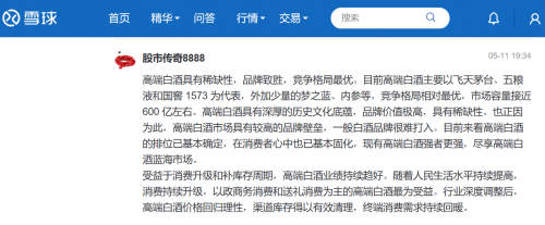 如何看待高端白酒的竞争格局?对此雪球用户@股市传奇8888认为,首先从白酒品牌自身来看,高端白酒具有稀缺性,拥有较高的品牌壁垒,目前高端白酒排位已基本确定,现有高端白酒强者更强,尽享高端白酒蓝海市场。从大环境来看,受益于消费升级和补库存周期,高端白酒业绩持续趋好。行业深度调整后,高端白酒价格会回归理性,终端消费需求将会持续回暖。