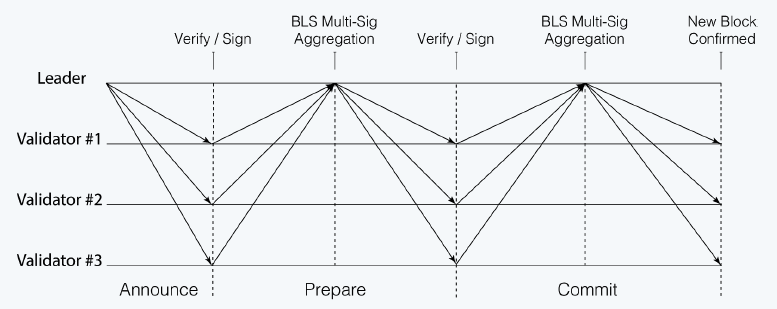 Harmony在PBFT算法的基础上进行了改良,采用FBFT快速拜占庭容错算法。其使用BLS签名方案进⾏多签名聚合,将节点间的通信复杂度降为O(n),从而将BFT类算法的应用范围由联盟链拓展到了公链当中。