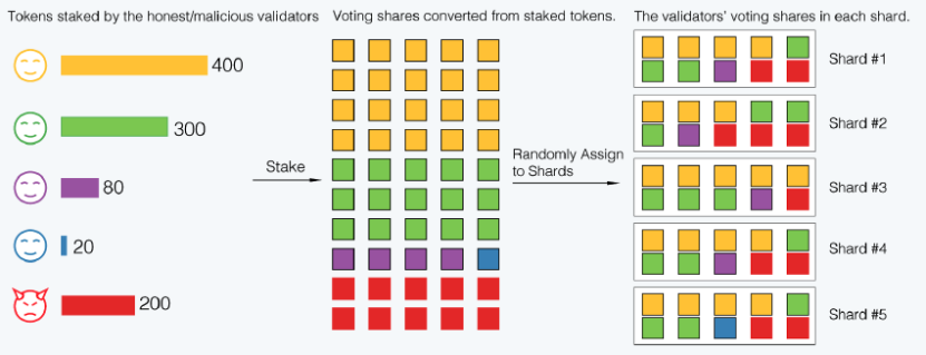 Harmony规定必须持有一定数量的token才有成为验证者的资格,将验证者的数量限定在合理的范围内。根据token的数量决定分配给Staker的投票份额数。在每个时代开始时,Staker的投票份额通过之前定的随机算法被随机分配给分片,其无法自主决定,其在每个分片内的投票份额百分比与全网其token数量的百分比一致。对某一分片进行攻击和对全网进行攻击的成本相同,均需要51%的全网总token数,从而保证了分片的安全性。