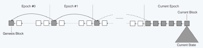 为了加快验证签名的速度,Harmony规定每个时期的第一个区块应包括到最后一个时期的第一个块的附加散列指针。这样,当跟踪到生成区块的散列指针时,新节点可以跳过这一时期内的区块。这将显着加快当前区块链状态的验证速度。