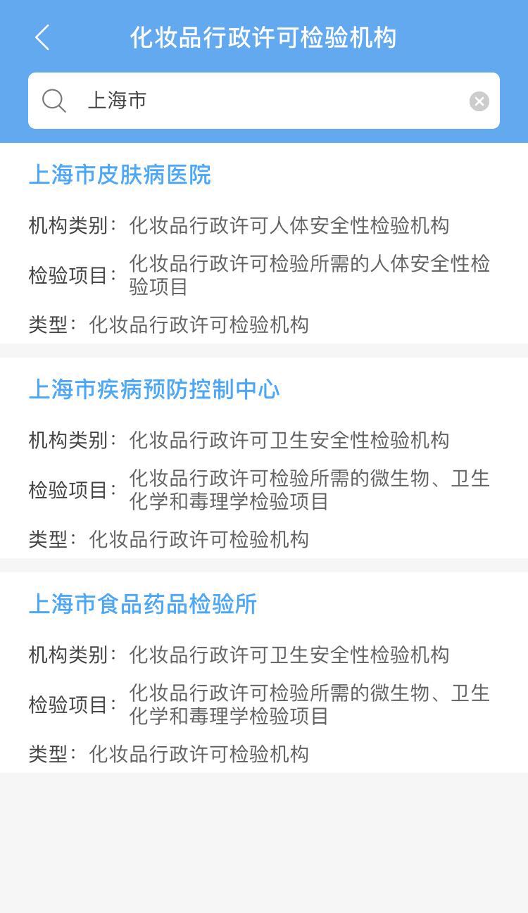 “化妆品监管”APP内还提供了检验化妆品真伪的机构,用户可搜索所在地城市名称,即可显示当地相关机构名称、地址及可检验项目。