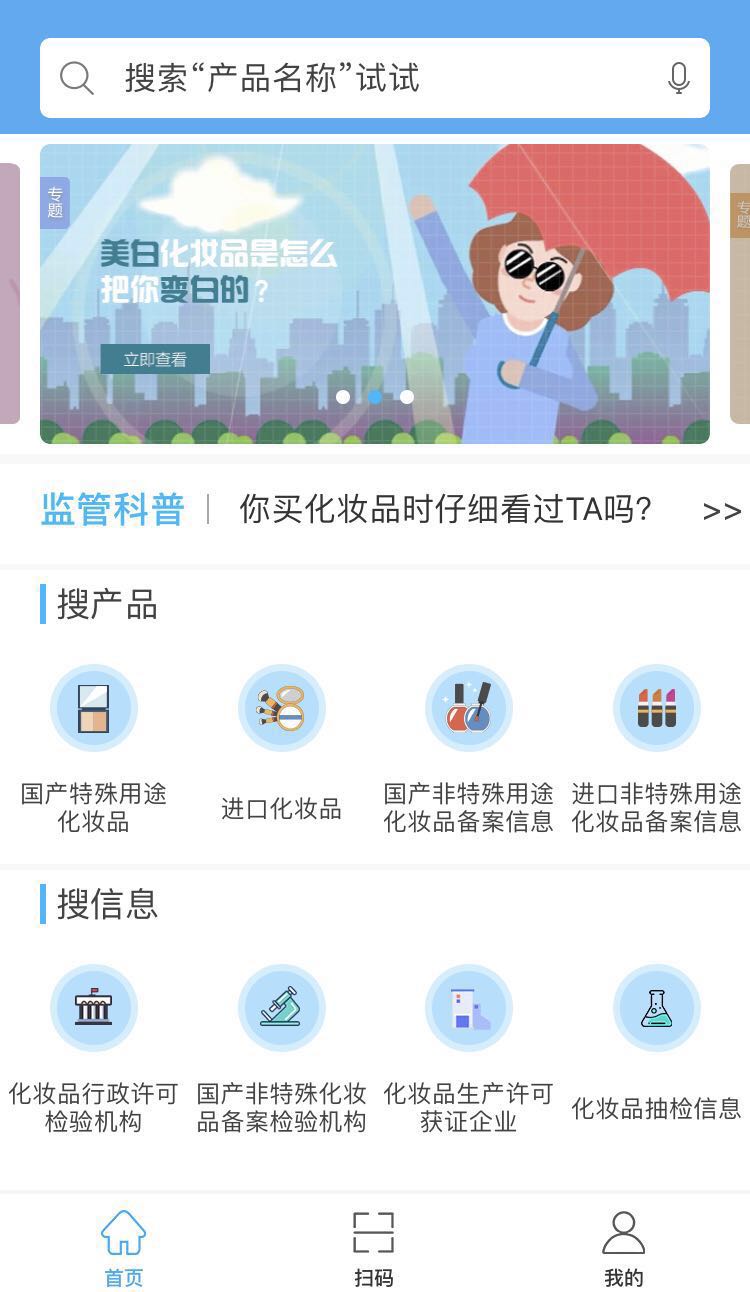 在该APP的中心面板位置有“扫一扫”功能,可识别商品条形码。扫描后会显示该商品的名称、备案信息及生产企业。