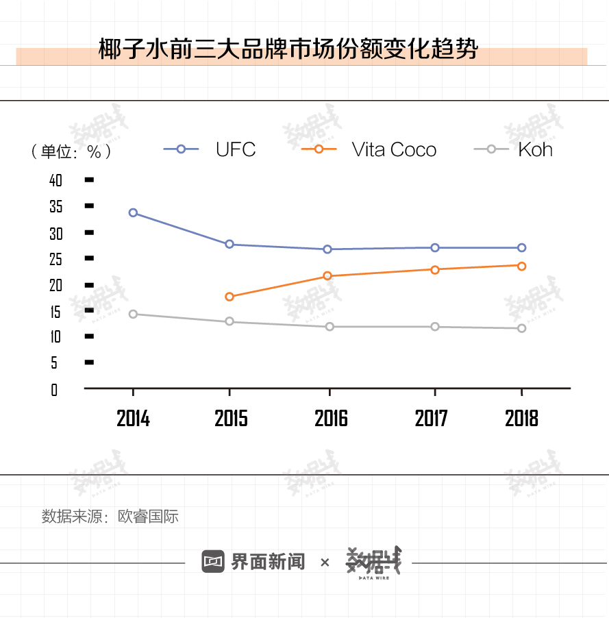 欧睿国际的数据显示,Vita Coco的市场占有率从2015年的17.6%增长至2018年的,增长速度超过了UFC和Koh。