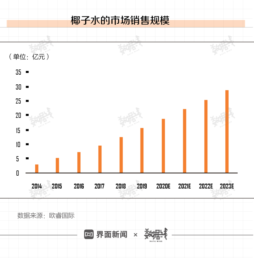 咨询公司欧睿国际(Euromonitor)向界面新闻提供的数据显示,2014-2018的5年间,椰子水类目产品的零售额从2.96亿元增长至12.48亿元。从销售额趋势看,这一品类未来5年仍然以较快的速度增长。2019年预计这一品类增长至15.48亿元,至2023年可达28.7亿元。椰子水市场前3大品牌分别为UFC(26.9%)、Vita Coco(23.7%)、Koh(酷椰屿,11.5%)。
