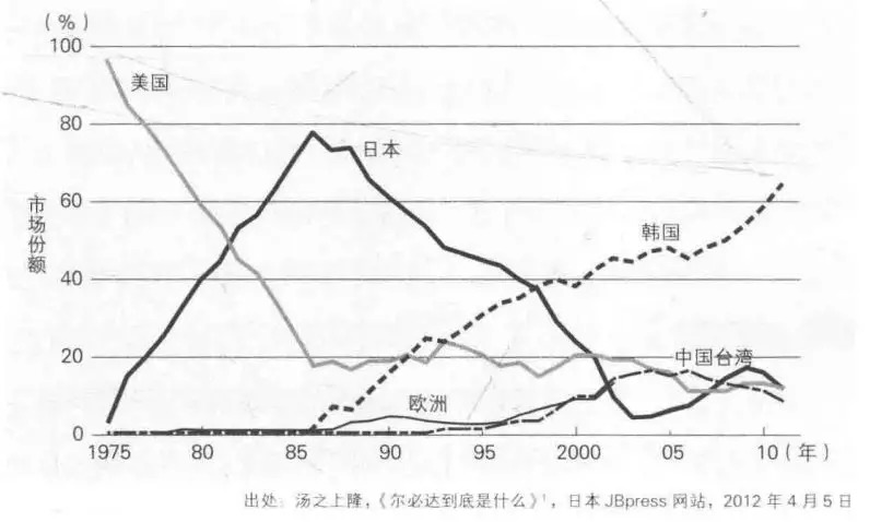 随后,日本在半导体芯片等更有技术含量的领域,也取得重大进步。1985年,日本DRAM芯片几乎占据全球市场份额的80%。