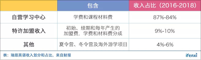收入则来源主要来源于三方面:自营学习中心,特许加盟收入和其他收入。自营学习中心为最重要的营收来源,包括学费收入和课程材料费;加盟模式营收其次,包括初次、再续约和每年产生的加盟费,以及学费和课程材料收入分成;其他收入则包含在线1对1业务Can Talk,夏令营、游学等项目营收,占比极低,仅为4%-6%。