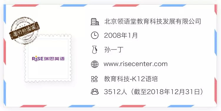 创立于2007年,瑞思英语的主营业务为线下3-18岁青少年培训。在当时以应试培训为主流的大环境里, 瑞思通过强调“素质教育“的理念和对接美国K12教育的学科英语另辟蹊径,用“直营+加盟合作”形式打开并快速抢占高端语培市场。