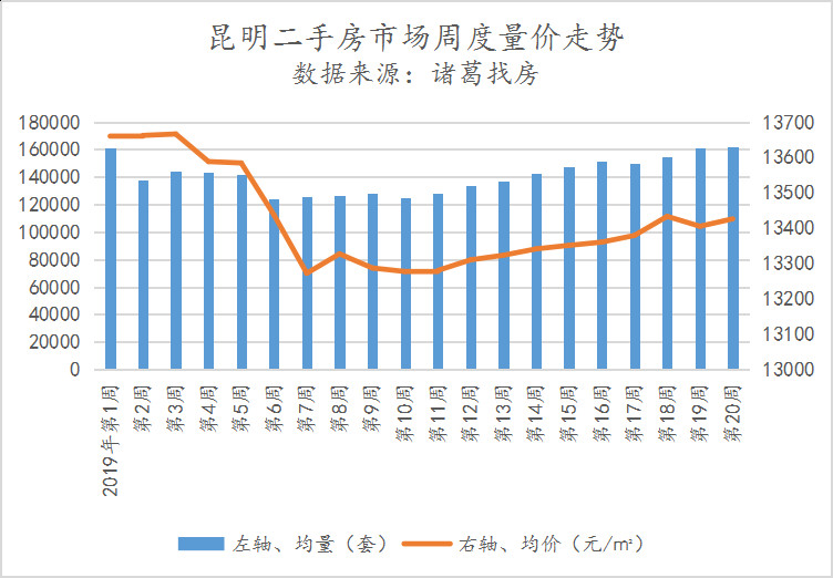 2019年第20周(5月13日-5月19日),昆明二手房市场平均挂牌房源量达到162262套,环比增加了0.45%;挂牌均价13426元/㎡,环比上涨了0.16%。在经历了第19周的均价轻微下调后,第20周的市场又一次迎来量价齐升。