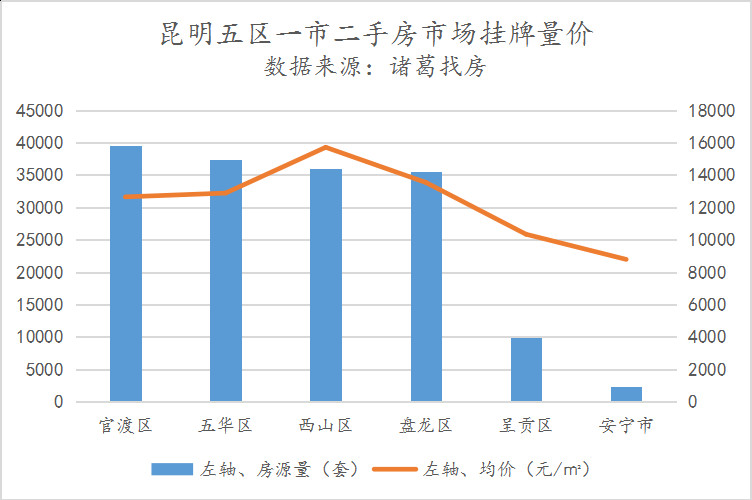 该周均价由高至低的城区分别为西山区15708/㎡、盘龙区13537/㎡、五华区12881/㎡、官渡区12647/㎡、呈贡区10340/㎡、安宁市8789/㎡,排序与第19周相同。