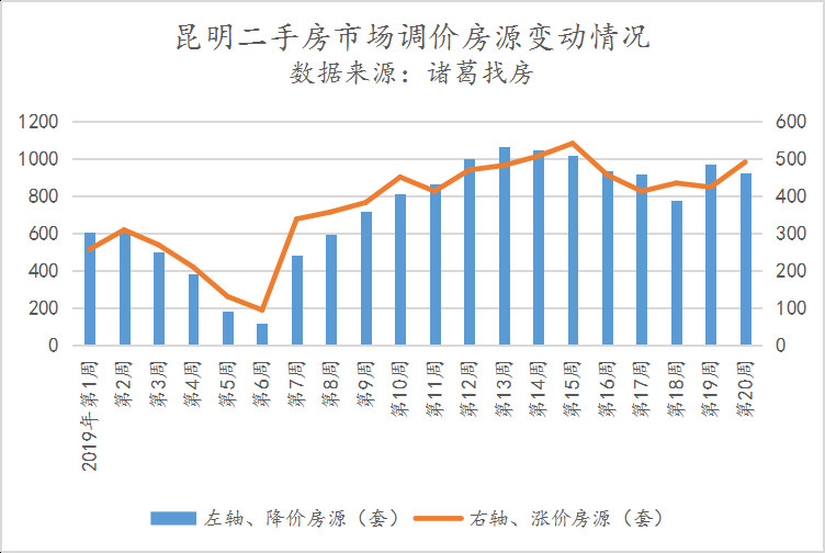 第20周,昆明二手房市场降价挂牌的房源达到925套,环比减少了4.64%;涨价挂牌的房源有490套,环比增加了15.84%。