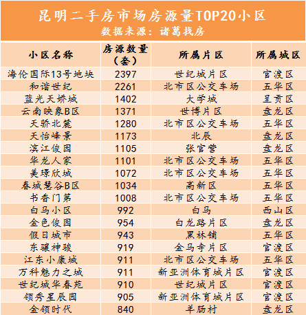 第20周昆明二手房市场挂牌房源量TOP20小区显示,北市区最多占9个,南市区第二占5个,主城二环内有2个,西市区有2个,东市区有2个。其中,房源量超过1000套的小区有11个,仍以北市区居多。