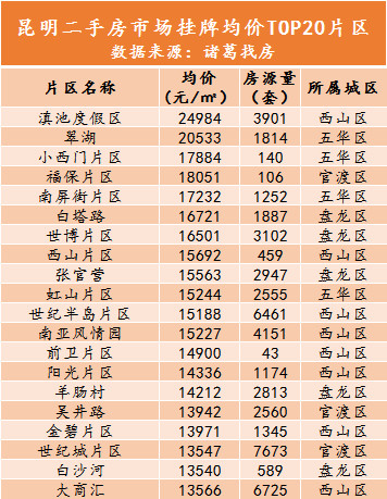 该周挂牌均价TOP20片区显示,20个片区均价都高出昆明本周均价。均价TOP20片区中西山区最多,其余依次为盘龙区、五华区、官渡区,呈贡、安宁则没有片区上榜。
