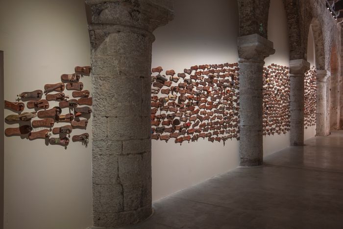 特别值得一提的作品有三件。由GR Iranna创作的装置作品《Naavu(我们在一起)》(Naavu [We Together])将馆内的一整面白墙覆上了一条由木屐构筑的“路”。在这里,艺术家没有援引更常与甘地联系在一起的视觉元素——比如眼镜和纺车(进行手工纺纱的甘地是印度独立运动的标志性图像,纺车也成为了印度国旗中的图案)——而是将焦点转向了他的木屐(在印地语中称为paduka)。细看墙上的这数百双木屐,每一双都与众不同,象征着一个个独立个体;它们汇聚在一起,既有甘地通过集体行走发起“非暴力不合作运动”的隐喻,又指向了当下人们齐心协力、共同改变现状的重要性。