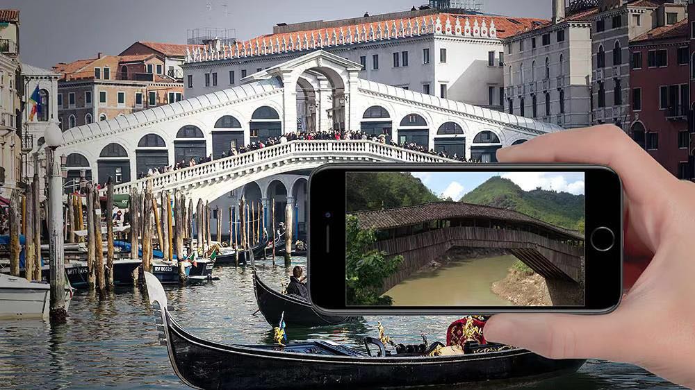 在中国馆的四人联展上,我们看到了一个略显古怪的混合叙事。一方面,中国馆想以拥抱科技的方式来体现中国之“睿”:就界面文化记者的观察,中国馆是本届威尼斯双年展中罕见地大量使用二维码、邀请观众通过手机与场馆和作品互动的国家馆。艺术家费俊制作了的一款题为《睿·寻》的增强现实APP,邀请观众当场扫码下载,随后,当观众打开APP,将手机镜头对准威尼斯的桥,手机屏幕中就会出现一座中国的桥。艺术家或许是想用这种方式来致敬中意文化交流,然而这个概念略显老套——早在1995年,蔡国强就在威尼斯双年展上施展过类似的创意,且更为巧妙大胆:他将一艘中国古代商船带到了威尼斯,同时运去了100多公斤的人参,把中药放在自动售货机里贩卖。同样是讲述中意文化交流的故事,蔡国强在那件题为《马可·波罗遗忘的东西》的作品中展现了更为丰富的层次和意味。