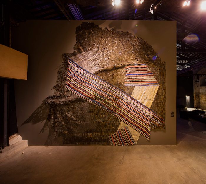 入口处悬挂着的巨大挂毯状作品《地球蜕皮》(The Earth Shedding Its Skin)颇为吸睛。凑近细看,能发现它是由瓶装饮料的金属瓶盖拼接而成的,令人惊叹的不仅是这件作品浩大的工作量,更是它背后的隐喻:作为工业资本主义全球链条的最低端,加纳承受着地球资源过度开采以及低附加值工业生产之痛。在迷宫般的空间里,观众还能看到一部讲述西非暴力屠象史的短片、加纳历史上首位女性专业摄影师Felicia Abban拍摄的肖像照,以及一座描述加纳废弃玻璃工厂的影像装置。