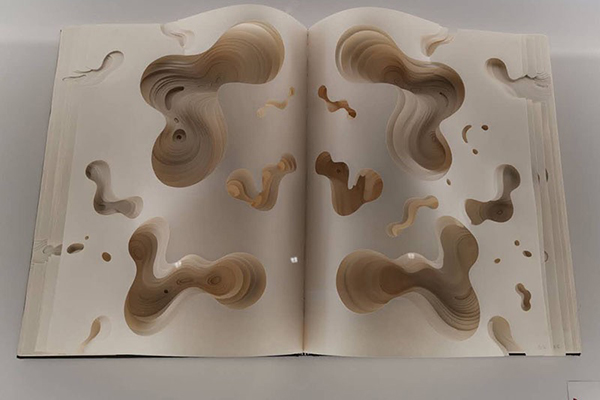 在另一方面,中国馆又展现出强烈的回归中国传统的倾向。艺术家陈琦从被书虫咬噬过的古籍汲取灵感,创作出拥有曲折洞隙的空间装置《别处》,“隐喻人类文明与力量的冲突与和谐。”大概是为了让现场观众更直观地了解艺术家的灵感来源,现场还展出了一本书页被切割出虫洞形状的书籍。然而这样的叙述太过停留于本国语境(甚至是艺术家本人的内心世界),这种“往前回溯”得到的东西,与其说是对今天的新问题的回应,不如说是一种自我陶醉和自说自话。某种程度上来说,科技和传统这两个面向的确都能反映当下中国的部分现实,然而由于缺乏一条主要线索,这两者的结合颇有些不伦不类。