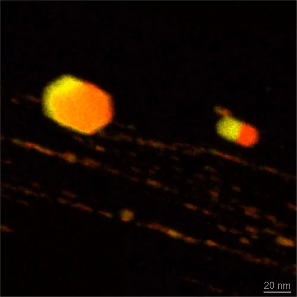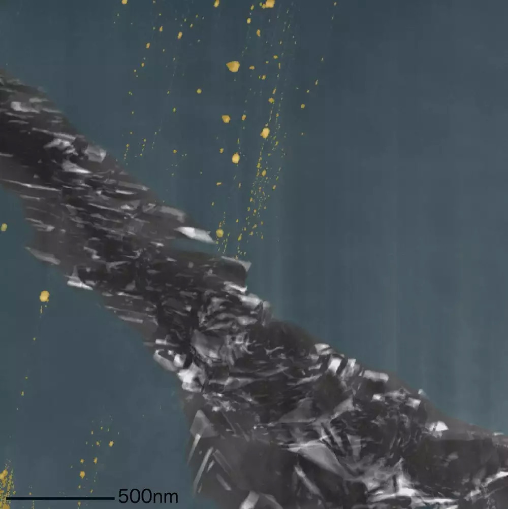 图为陨石样本的扫描透射电子显微彩像,蓝色为钻石区,黄色为杂质区,灰色为石墨区。