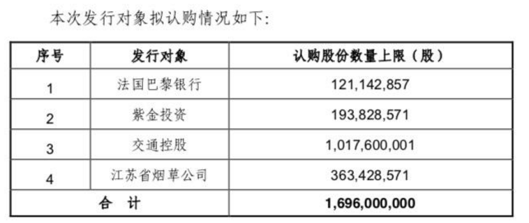 界面新闻记者注意到,与去年7月的被否定增预案相比,此次定增规模、数量均保持不变,但发行对象从5家减少至4家,除了紫金投资和交通控股,其他发行对象都出现了变化,太平人寿、南京高科和凤凰集团退出,法国巴黎银行、江苏烟草加入。