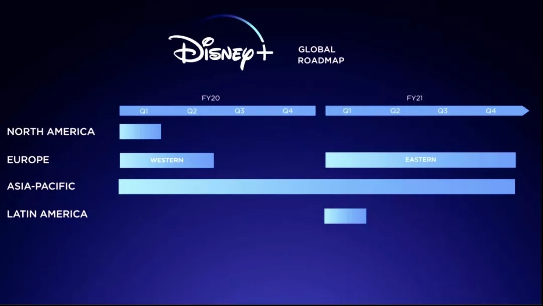 在今年年底率先登陆北美市场后,Disney+ 将于 2020 年初在西欧和亚太地区上线,2020 年底在东欧和拉丁美洲推出。Disney+ 的目标是五年后每年产出 50 部原创作品,在全球范围内收获 6000 - 9000 万订阅用户。再加上已拥有坚实基础的ESPN+和Hulu,迪士尼未来的流媒体矩阵也将拥有超过1亿的总用户。