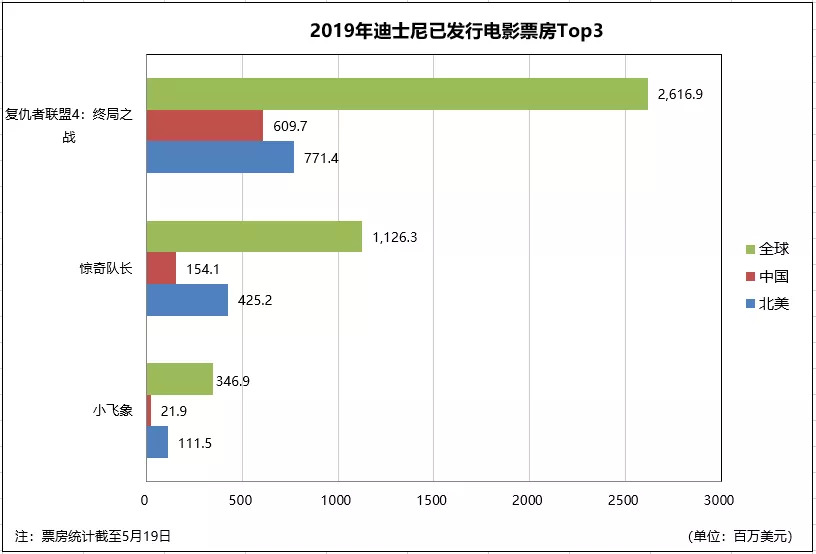 2019年刚过1/3,在“漫威电影宇宙”阶段性完结的感召下,《复仇者联盟4:终局之战》全球累计逾26亿美元并仍在继续攀升,再加上《惊奇队长》(11.26亿美元)和《小飞象》(3.46亿美元),助推迪士尼全球的总成绩已经突破40亿美元,已超过2016年巅峰值(76.05亿美元)的一半,北美同样迫近2018年纪录(30.92亿美元)的50%;考虑到接下来还有众多重磅影片待映,迪士尼在2019年再创新高的可能性非常大。