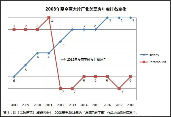 到了2012年,派拉蒙手中的漫威电影发行权到期,形势开始出现调转:派拉蒙从头名位置光速坠落,甚至多次被狮门影业挤出“六大”之列;而刚接手漫威就迎来《复仇者联盟》的“开门红”,米老鼠一跃晋升第一军团,并稳扎稳打固守高位。