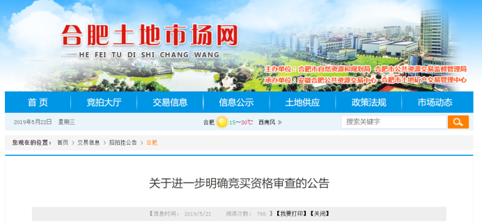5月21日,合肥土地市场网发布《关于进一步明确竞买资格审查的公告》(下称《公告》)。《公告》表示,自即日起,竞买人在办理含有商品居住用途地块的竞买报名登记手续时,须提交其控制的子公司、控制其的母公司或其母公司控制的其他子公司、或其母公司控制的其他子公司控制的子公司等关联公司不参加同一宗地竞买的书面承诺。