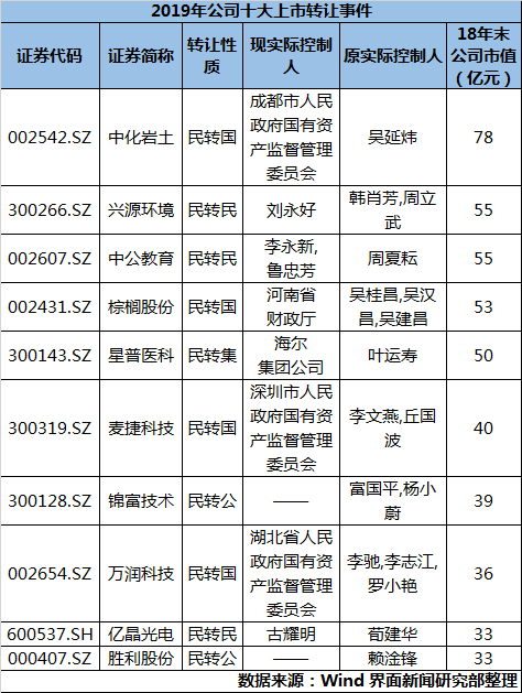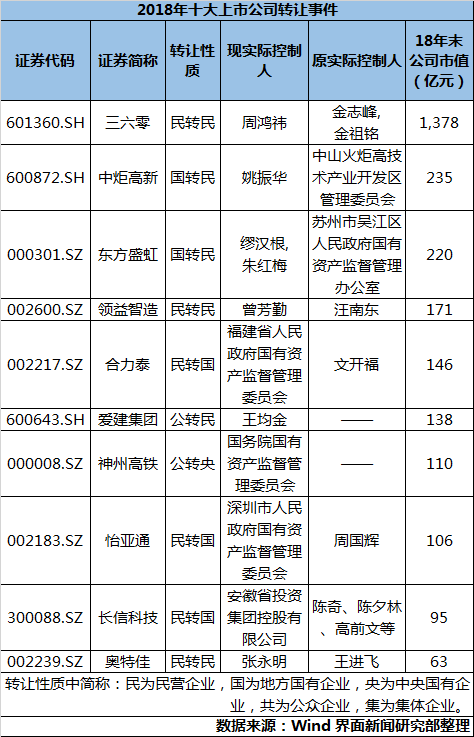 界面新闻针对近两年上述实控人变更情况予以整理,以2018年末被转让的公司市值为排名依据,结果如下: