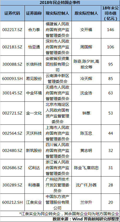 界面新闻对2018年发生的公司属性由民企变更为国企的情况进行了统计,结果如下: