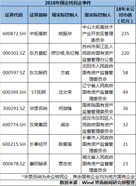 界面新闻对2018年发生的公司属性由国企变更为民企的情况进行了统计,结果如下: