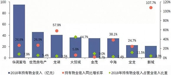 华润置地凭借重点发展以购物中心为代表的投资物业战略,致力于提升投资物业的开发及运营效率,2018年持有物业收入稳定增长,高达95.2亿元,远高于其他代表企业,凭借自身的资源优势及优秀的经营能力,实现了其持有型物业收入的稳步增长。