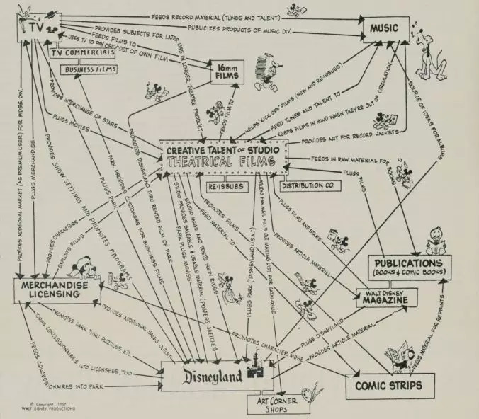 迪士尼就是这方面的鼻祖,早在1957年沃尔特·迪士尼就明确了迪士尼的生态蓝图,他绘制了一份复杂的流程图:明确电影处在中心位置,主题公园、周边商品、音乐、出版物和电视节目环绕四周,它展示了每个产品之间是如何相互补充促进的。