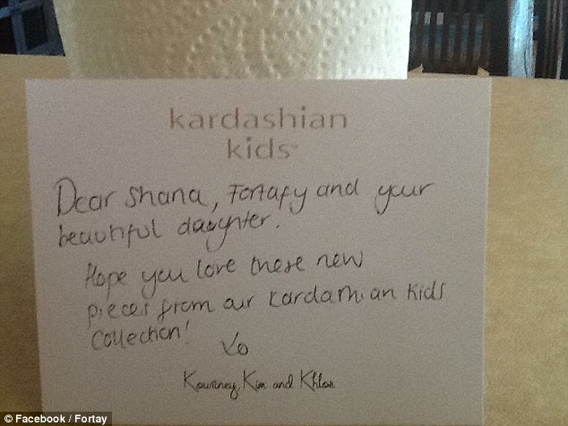 另一份惊喜来自卡戴珊姐妹。她们为这家人送上了礼物,还附上了手写便签,上面写道:“亲爱的Shana、Fortafy和你们漂亮的女儿,希望你们能喜欢卡戴珊儿童品牌的新款衣服。”