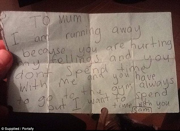 小Fortafy为了阻止妈妈出去工作,写道:“我逃跑,因为你伤害到了我的感情,因为你不花时间和我在一起。你总是去健身,但是我想和你在一起。”