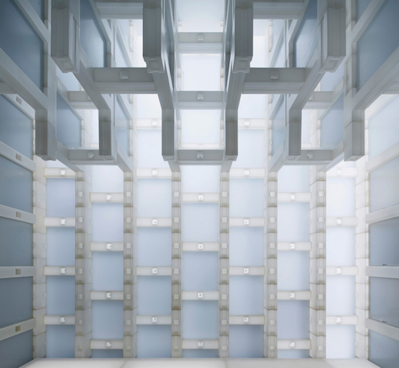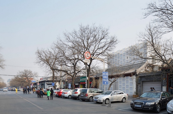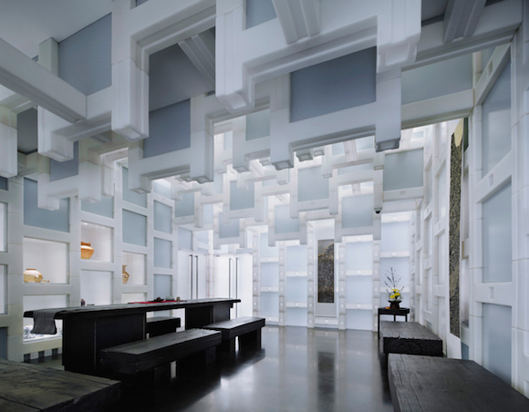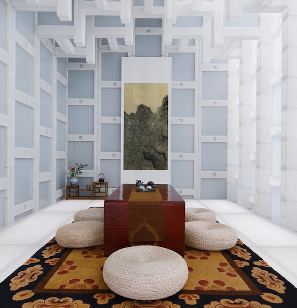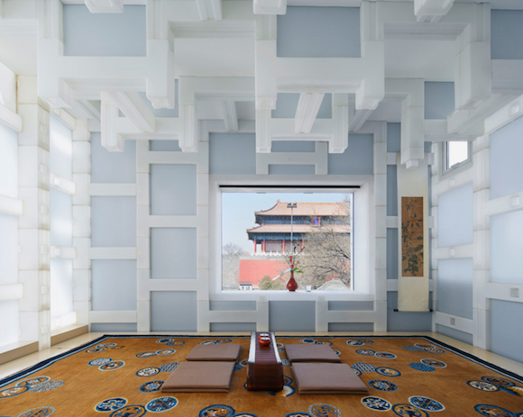 这间茶馆位于故宫东门一个四合院里。整个茶馆从天花板到墙壁使用了H形和方形的半透明白色塑料模块进行拼接组装,使得白天时阳光会有一部分从墙体“渗”进来。这么一来,室内采光很自然,白天用不着点灯,而且半透明的塑料模块还能有一种大理石的质感,让茶室看上去更古典。