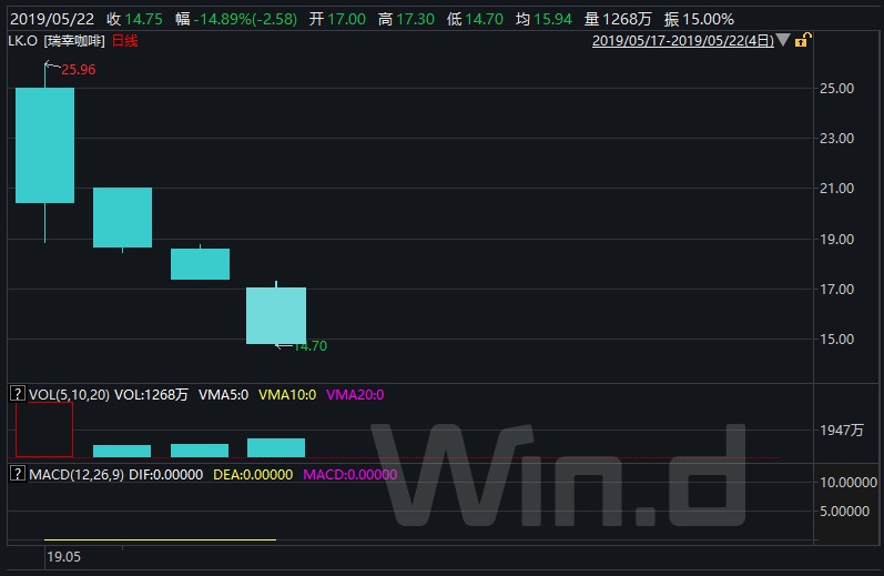 5月22日,美股上市仅4个交易日的中概股瑞幸咖啡(LK.O)股价重挫近15%。截至当日收盘,瑞幸报收14.75美元/股,已跌破17美元的发行价。