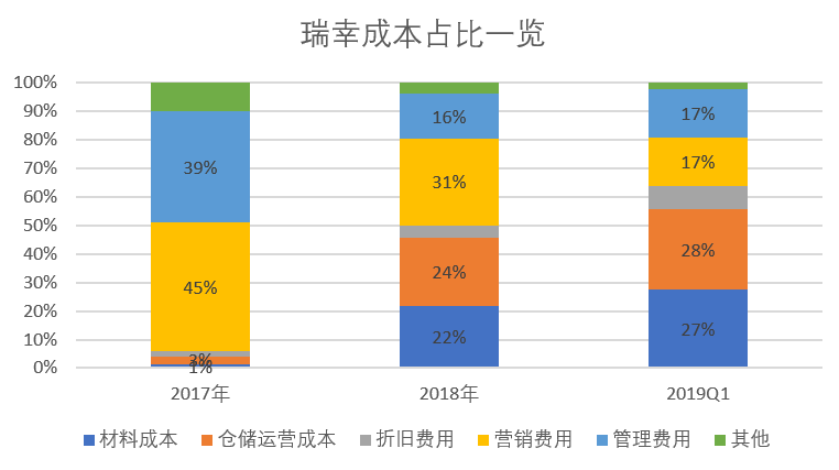由于2017年瑞幸还未初具规模,因此不再展开讨论。从2018年数据来看,原材料成本占总成本的22%,直到2019Q1才上升至27%。而运营成本以及销售费用,则更大程度上占据了瑞幸的成本,直接导致其亏损。特别是2018年,瑞幸的营销成本占总收入的89%,基本上卖出去一杯20元的咖啡中,有18元都是在为营销费用买单。