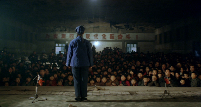 在这场演出中,三个镜头都从观众视角对准了舞台,没有《站台》里汾阳县农村文化工作队慰问演出时,那个从舞台上直视观众的镜头。莫言、苏童、欧阳江河等一众作家,以及当地领导、嘉宾坐在前排。摄影机轨道之后,后排的普通观众,也就是当地的乡亲,与《站台》里的观众同样踊跃,座位不够,从附近商家那儿借来长条木凳“排排坐”也行,充满了电影里难以表演出的那种原始而生动的兴奋劲和好奇心。
