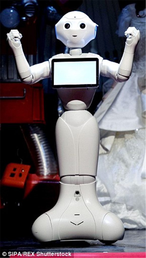 婚礼还请来了更多的Pepper做服务生,她们穿上了衬衫和萌萌的背带裙,忙着在现场接待客人: