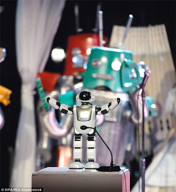 一只迷你黑白机器人Palmi对着麦克深情献唱。Palmi是一只学习机器人,能够在和人类交流的过程中成长。