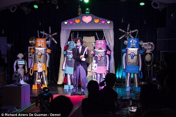 这场婚礼的司仪阵容异常强大,包括软银公司(Softbank)的明星机器人Pepper、搞笑艺人阵内智则和原NMB成员山田菜菜。