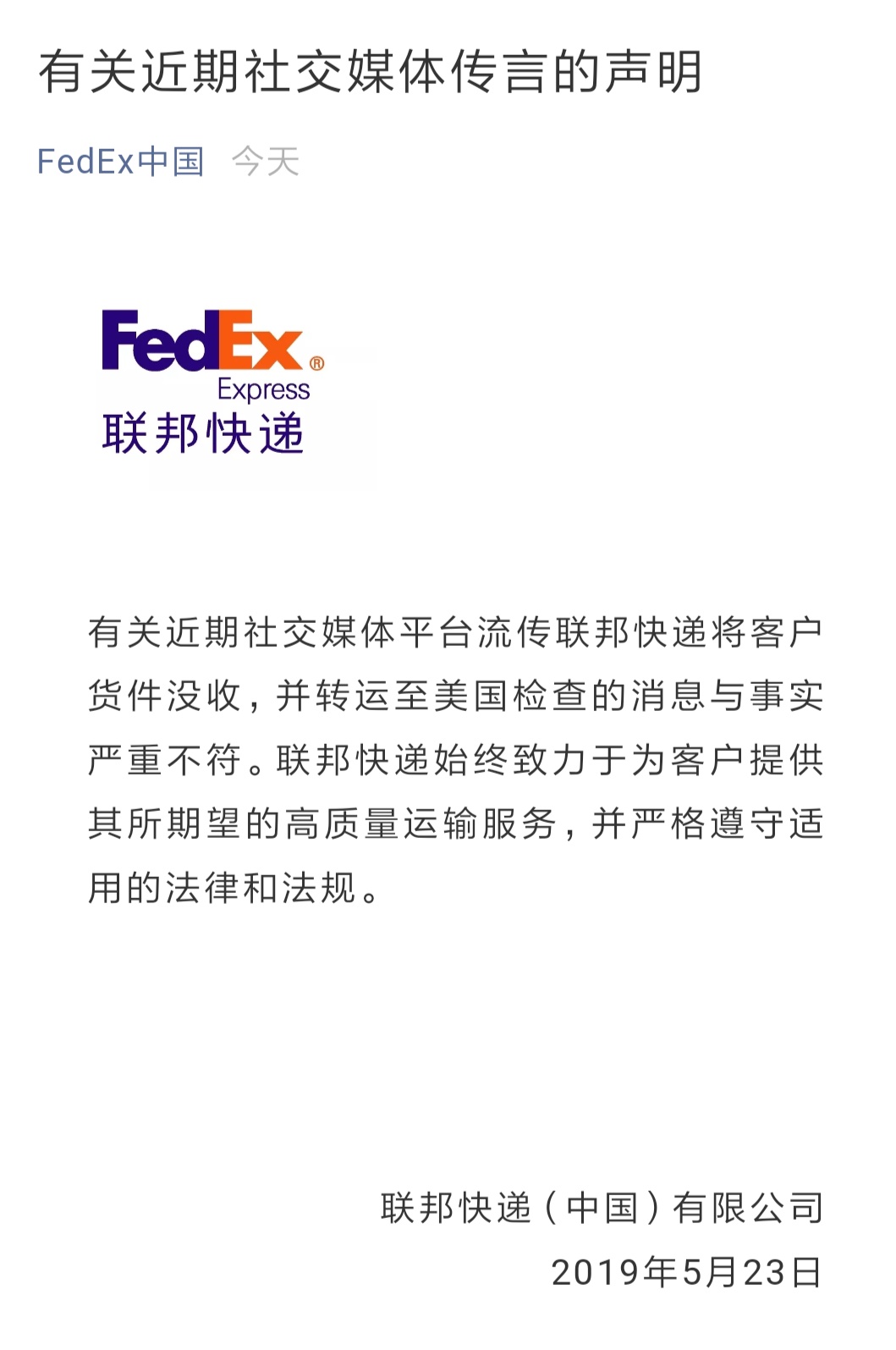 联邦快递中国公司今晚通过官方微信发布声明,予以否认。声明称,社交媒体平台流传的“联邦快递将客户货件没收,并转运至美国检查”的消息与事实严重不符。联邦快递始终致力于为客户提供其所期望的高质量运输服务,并严格遵守适用的法律和法规。
