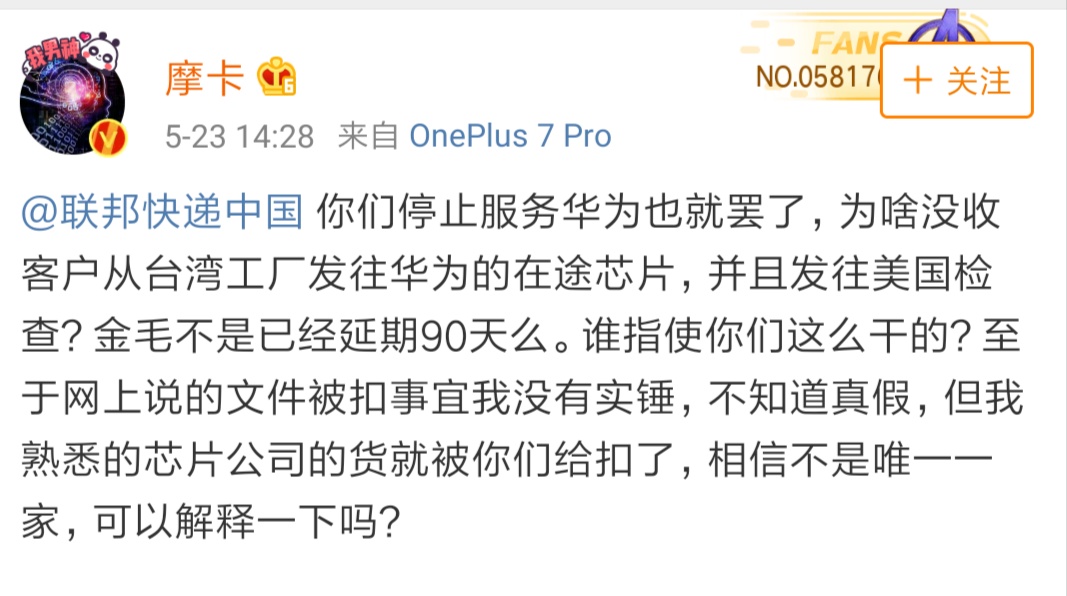 今日下午,微博认证用户“摩卡”公开发帖质疑@联邦快递中国 称:“你们停止服务华为也就罢了,为啥没收客户从台湾工厂发往华为的在途芯片,并且发往美国检查?金毛不是已经延期90天么。谁指使你们这么干的?至于网上说的文件被扣事宜我没有实锤,不知道真假,但我熟悉的芯片公司的货就被你们给扣了,相信不是唯一一家,可以解释一下吗? ”