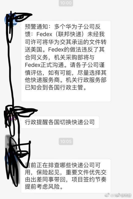 在此前的传言中,一张微信群聊截图显示“多个华为子公司反馈联邦快递未经允许将华为交其承运的文件转运到美国。”