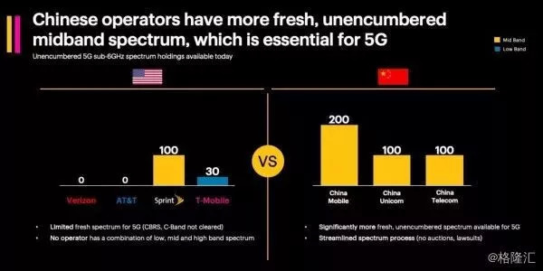 相对中国5G,缺中频段、基础覆盖弱,正是美国5G的最大弱势,而T-Mobile和Sprint合并后则刚好可以补缺这一弱势。事实上,此前T-Mobile和Sprint在提交给监管层的申请报告中就曾多次对标中国5G。其中,据一份申请报告指出,尽管FCC在基础设施改革和频谱拍卖方面取得的了进展,但中国仍然是5G竞争的明显领导者,具有一些关键优势。如果不采取激进行动,美国将会无法阻止中国的进步。