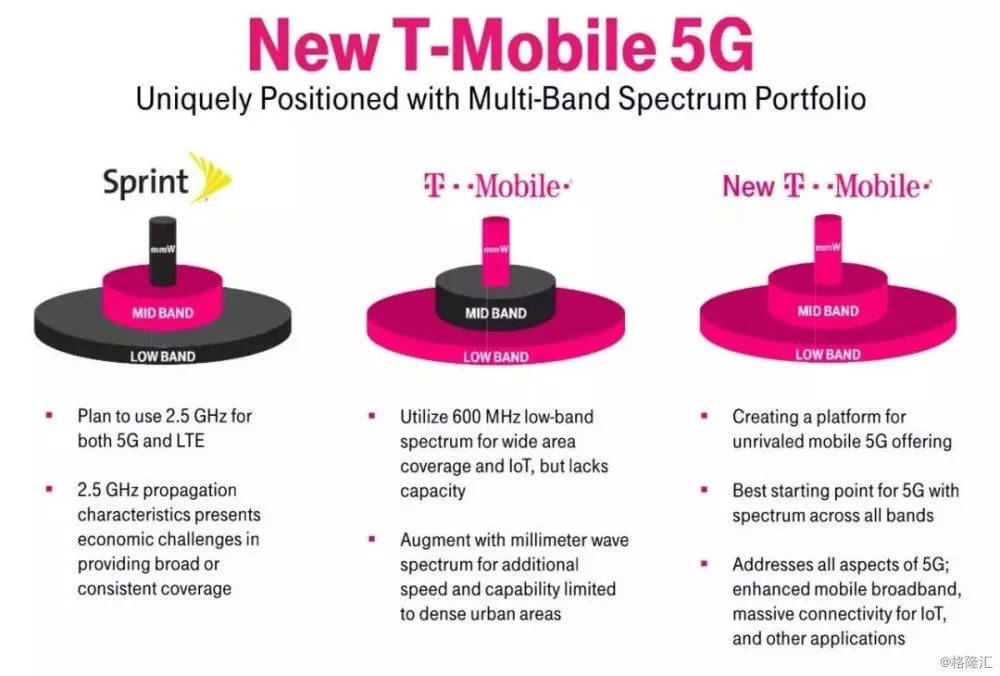 就技术层面而言,若T-Mobile和Sprint合并,Sprint拥有2.5GHz中频段,T-Mobile拥有600MHz低频段和毫米波高频段,由此两家运营商可利用低、中、高频段三层组网,600MHz做覆盖层,2.5GHz做容量层,毫米波做高容量层(热点),既做广了网络覆盖,又做厚了网络容量,从而可以建成一张广覆盖、大容量的5G网络。