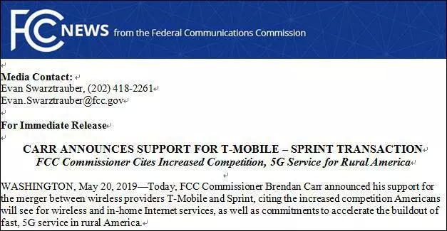 5月20日,美国FCC委员会主席Ajit Pai发表的声明显示,他将批准美国第三大第四大全国性电信运营商Sprint和T-Mobile合并,并称他们的合并有助于美国在全球5G竞赛中取得优势。